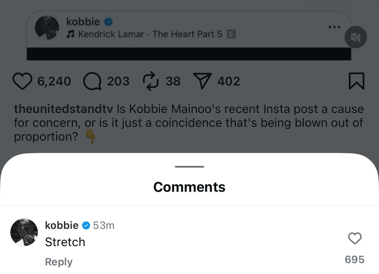 记者Nathan Salt对此评论:“Kobbie Mainoo分享了电影《爆裂鼓手》中的一张照片,从某种程度上讲,这是一个冉冉升起的新星永远无法得到他们导师/教练认可的故事。有趣。”