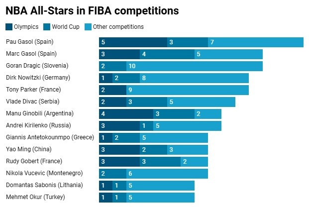 星空体育平台-美媒统计NBA球星为国出战大赛次数:大加15次居首 姚明8次并列第9